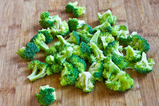 I cut the broccoli flowerets into small pieces so they'd be well-distributed in the egg mixture. The secret to cutting up broccoli and keeping the cutting board clean? Cut through the broccoli stem, then pull it apart to avoid those broccoli "crumbs" you get when you cut through the floweret part.