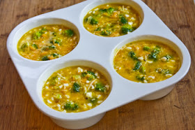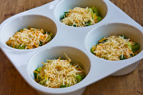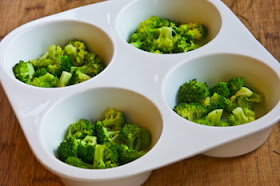 Pour the egg mixture over the broccoli and cheese, dividing it evenly among the four cups.  (I stir slightly with a fork after the cups are filled so the ingredients are evenly distributed in the cup.)