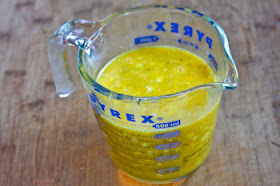 I cut the broccoli flowerets into small pieces so they'd be well-distributed in the egg mixture.  The secret to cutting up broccoli and keeping the cutting board clean?  Cut through the broccoli stem, then pull it apart to avoid those broccoli "crumbs" you get when you cut through the floweret part.