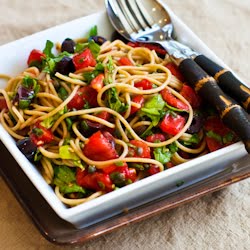 (Makes 3-4 servings, recipe adapted slightly from Spaghetti with Tomatoes, Arugula, Capers, and Olives by Rose Gray and Ruth Rogers in Bon Appetit August 2006. I couldn't find the recipe online.)
